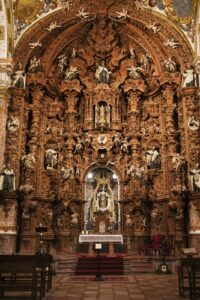 Este enorme retablo se concibió como un himno carmelitano, en el que los santos y santas relacionados con la orden se ven acompañados de toda una corte de ángeles adolescentes y pequeños, que ya tocan instrumentos musicales, ya sostienen cartelas o guirnaldas, o simplemente, juntan las manos en gráciles actitudes, que parecen tocar palmas. Resulta sorprendente pensar que todo este inmenso artilugio barroco no es sino el marco que sirve de embocadura al camarín central, en el que se guarda la imagen de la Virgen del Carmen con su Niño.